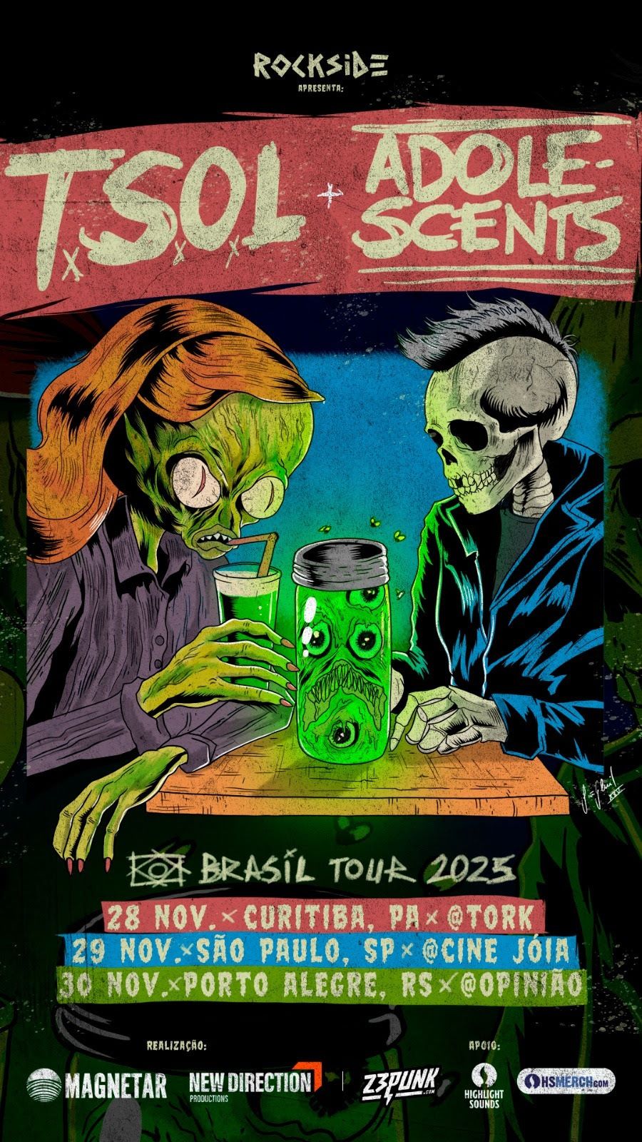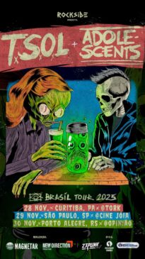 T.S.O.L. e Adolescents, dois ícones do punk rock norte-americano surgidos nos anos 1980 e donos de um público fiel no Brasil, estão de volta à América do Sul em novembro — e três apresentações acontecem em solo nacional. Em Porto Alegre o show será dia 30/11, no Opinião. A turnê é uma realização da ND Productions, em parceria com a Magnetar.