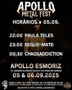O metal nacional volta a ganhar espaço no mapa dos festivais com a chegada do Apollo Metal Fest, evento que se estreia nos dias 5 e 6 de setembro de 2025 no Apollo Bar, em plena Praia de Esmoriz.