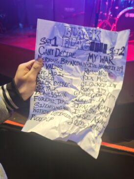 La foto del setlist —arrugado, con tinta gruesa y caligrafía hecha a mano— revela la intención de ofrecer un repaso amplio por el legado del hardcore californiano. La Parte A incluyó piezas como: