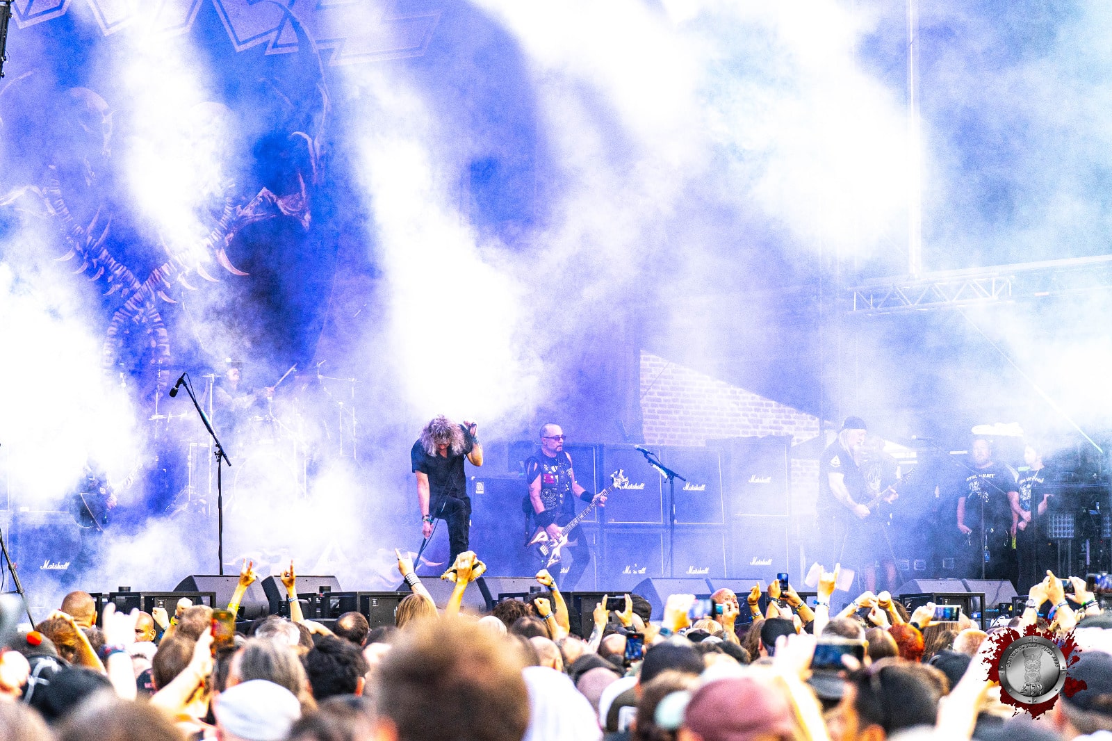 Mais tarde, descobri que eles abriram com “Rotten to the Core“, do álbum de estreia de 1985, que infelizmente perdi, pois estava ocupado perdendo a cabeça com Malignancy. É o que acontece com festivais que abrigam muitos palcos diferentes: apresentações de bandas se chocam e se chocam! Por isso é importante agendar com antecedência. Mesmo assim, consegui assistir a um trecho de “Deny the Cross“, do álbum “Taking Over“, de 1987. Gosto dessa música, ela tem riffs confiáveis e os vocais são tão loucos quanto possível na discografia do Overkill. A próxima foi “ELIMINATION“, que é um bop total ao vivo, como na gravação, e cantei até o fim com meu amigo Ayberk.