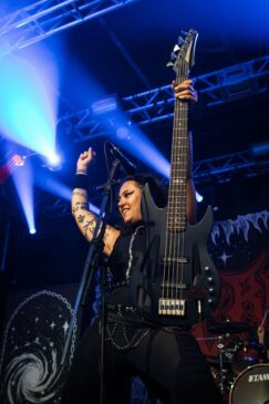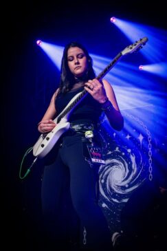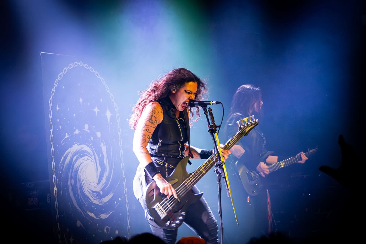 Ao lado dela, Tainá Bergamaschi mostrou por que é uma das guitarristas mais respeitadas da nova geração do metal. Com riffs afiados, solos bem construídos e uma presença de palco marcante, ela equilibra brutalidade e sensibilidade musical com naturalidade.