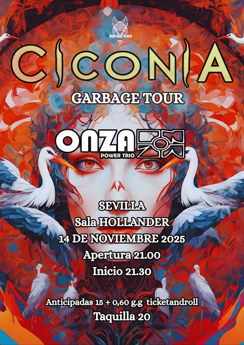 Diretamente de Valladolid chega o trio instrumental Ciconia, formado em 2014 por Jorge Fraguas, Dani Dean e Sergio Jiménez. Influenciados por nomes como Opeth, Porcupine Tree e Long Distance Calling, eles descrevem seu som como “instruMETAL”: um equilíbrio entre melodias atmosféricas e passagens pesadas, progressivas e complexas. Essa combinação conduz o ouvinte por paisagens sonoras diversas e dinâmicas. Durante 2025, a banda percorreu a Europa com seu mais recente álbum, Synaesthetic Garbage, dentro da turnê Garbage Tour. Embora parte da tour espanhola tenha contado com a banda Noah Hysteria, nesta data especial o palco será dividido com outro lendário trio nacional: Onza.
