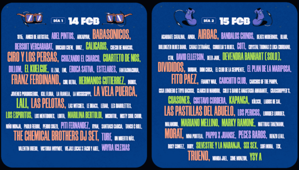 1915 – Abel Pintos – Ainda – Airbag – Amigos De Artistas – Arkadyan – Babasonicos – Bandalos Chinos – Beats Modernos – Bersuit Vergarabat – Blair – Brigado Crew – Bruz – Bulldozzer Blues Band – Caligaris – Caras ExtrañAs – Chechi De Marcos – Ciro Y Los Persas – Cordelia Andrada – Coti – Cruzando El Charco – Rystal Thomas & Luca Giordano – Ctm – Cuarteto De Nos – David Ellefson – Deer Jade – Devendra Banhart (Solo) – Dillom – Divididos – Dorian – Dum Chica – El Club De La Serpiente – El Kuelgue – El Plan De La Mariposa – El Zar – Emi – Eruca Sativa – Estelares – Fantasmagoria – Fito Paez – Franky Wah – Franz Ferdinand – Gauchito Club – Gauchos Of The Pampa – Girl Ultra – Gisa Londeiro & Toyo Bagoso – Glauco Di Mambro – Golo´S Band & Anastasia Amarante – Grasshopper – Guasones – Gustavo Cordera – Hermanos Gutierrez – Indios – Jovenes Pordioseros – Kapanga – Kill Flora – KöLsch – La Franela – La Mississippi – La Vela Puerca – Labios De Sal – Lali – Las Pastillas Del Abuelo – Las Pelotas – Las Witches – Le Dracs – Lehar – Les Diabolettes – Los Espiritus – Los Mentidores – Los Pericos – Lourdes Lourdes – Louta – Malandro – Mariano Mellino – Marilina Bertoldi – Marky Ramone – Matthias Tanzmann – Microtul – Misty Soul Choir – Morat – Nina Portela – NiñO Monja – Pablo Fierro – Pappo X Juanse – Peces Raros – Perro Suizo – Piti Fernandez – Renzo Leali – Rosy Gomeez – Rudy – Ryan – Santiago Garcia – Silvestre Y La Naranj – Six Sex – Sofi Mora – T&K – Tango & Roll – The Chemical Brothers (Dj Set) – Trueno – Turf – Un Muerto Mas – Valentin Huedo – Victoria Whynot – Viejas Locas X Fachi Y Abel – Wanda Jael – Wayra Iglesias – Ximena Monzon – Ysy A – Artistas Invitados: Agarrate Catalina.