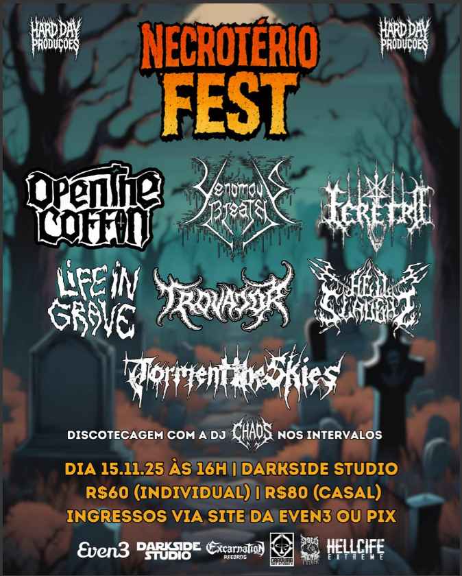 Está chegando a primeira edição do Necrotério Fest e é com imensa satisfação que anunciamos o line-up completo com as oito bandas que irá compor o primeiro festival de Halloween inteiramente dedicado à música extrema no Nordeste. Um encontro histórico que promete reunir excelentes bandas, energia única e a verdadeira celebração da cena underground em sua forma mais extrema e agressiva.