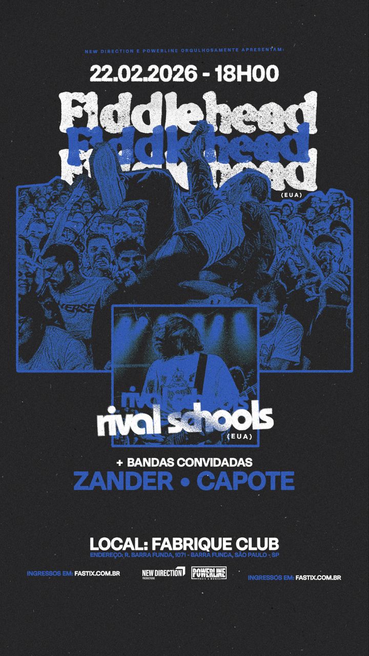 Fiddlehead e Rival Schools, duas exaltadas e potentes bandas do rock alternativo/post-hardcore mundial, respectivamente das gerações 2010 e 2000, estreiam no Brasil com show único no dia 22 de fevereiro (domingo), com show único em São Paulo/SP. O evento, no Fabrique Club, agora ganha duas grandes bandas nacionais: Zander e Capote.