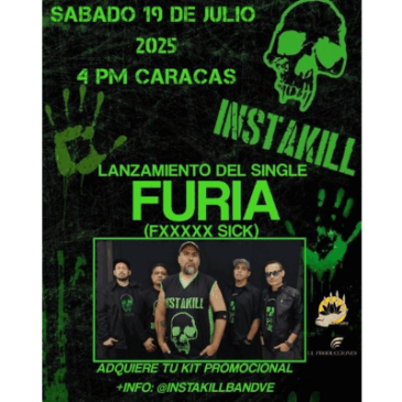Para celebrar este importante lançamento, o Instakill realizará um evento exclusivo em um renomado estúdio em Caracas no sábado, 19 de julho de 2025. Este evento especial contará com a presença da imprensa, que participará de uma festa de audição para vivenciar o poder de “Furia” pela primeira vez. Além disso, a banda fará um show intimista para seus fãs mais próximos, criando uma atmosfera única de conexão e celebrando juntos este novo hino. Teremos o prazer de ter Karen Patricia (@itskarenpatricia) como nossa anfitriã no evento, adicionando um toque especial à noite.