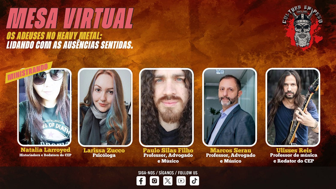 Para tanto, temos como convidados Larissa Zucco, Psicóloga e Neuropsicóloga; Paulo Silas Filho, Professor, Advogado, Escritor e “tocador de baixo“; Marco Serau, Professor, Advogado, Escritor e baterista “quando a agenda permite“; Ulisses Reis, Guitarrista, Professor, proprietário do Espaço Art & Vida e Redator do Cultura em Peso e por fim, coordenando, Natalia Larroyed, bacharel em direito, historiadora, redatora do Cultura em Peso e “ex-musicista, apenas apreciadora amadora do estilo“.