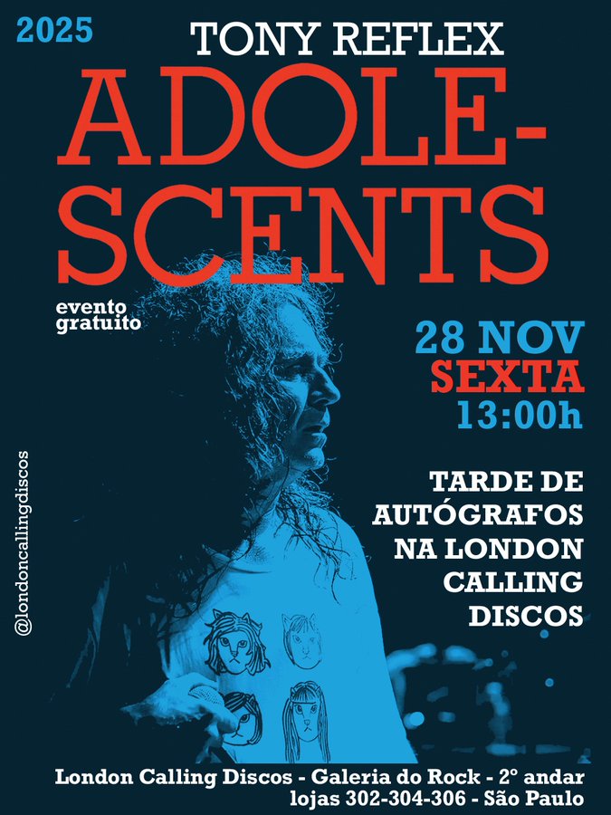 Tarde de autógrafos com Tony Reflex (vocalista The Adolescents), na London Calling Discos, acontecerá na próxima Sexta–Feira, 28/11/2025, tendo seu início às 13 horas.