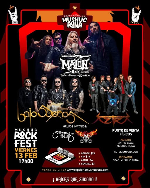 El Mushuc Rock Fest llega como uno de los encuentros más explosivos del rock y metal en Ecuador, uniendo música, identidad y energía en el marco de los Carnavales Mushuc Runa. Este festival no es solo un concierto: es una celebración de la cultura, la fuerza del sonido pesado y la hermandad de quienes viven el rock como forma de vida.