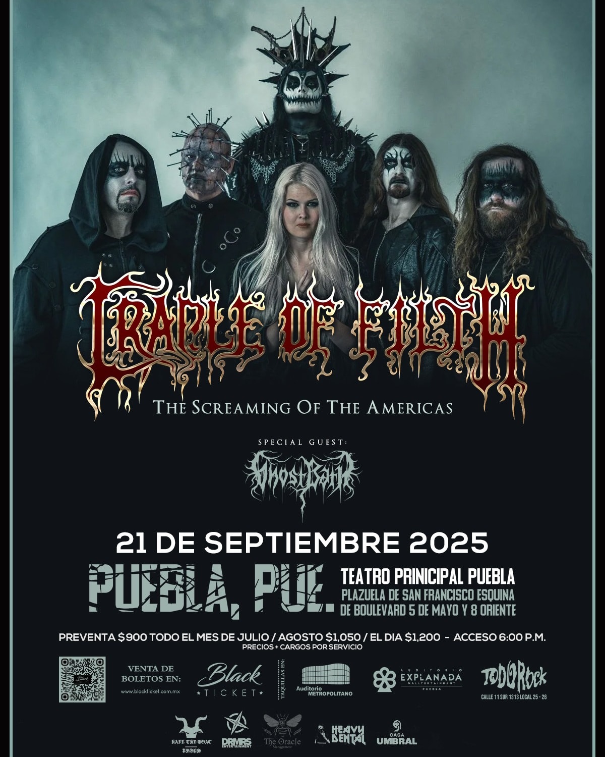 Cradle of Filth ofrecerá un concierto inolvidable el 21 de septiembre de 2025 en una de las ciudades más emblemáticas y emergentes del país. Originalmente programado para llevarse a cabo en La Guarida, la gran demanda del público metalero poblano ha llevado a que el show se traslade al histórico Teatro Principal de Puebla, un recinto con mayor capacidad y una atmósfera perfecta para una noche gótica y extrema.