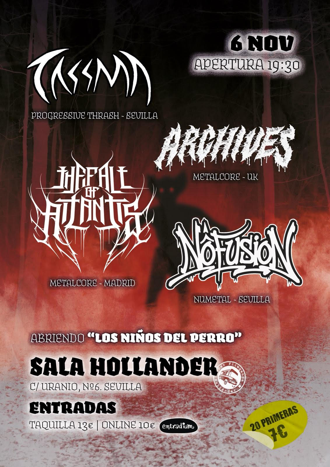 Na próxima 6 de novembro, os fãs de metal de Sevilha têm um encontro marcado com o underground. A partir das 19:30, no polígono Calonge, acontecerá uma noite em que cinco jovens e enérgicas bandas se reunirão para colocar tudo de cabeça para baixo: Tassma, The Fall of Atlantis, Archives, NoFusion e Los Niños del Perro. Como não poderia ser diferente, este barulho todo acontecerá na mítica Sala Holländer, lar do underground sevillano.