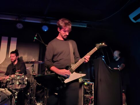Voltamos ao álbum Men Eeater com as faixas “Hermit” e “Worshipers“, músicas essas que representam dois momentos particularmente marcantes na construção atmosférica e emocional deste disco. “Hermit” desenhou um percurso introspectivo, começando com uma cadência mais leve, quase meditativa, marcada por riffs envoltos em fuzz e uma aura psicadélica que foi ganhando densidade até desaguar num crescendo sludge tenso e poderoso. A sensação de inquietação, resultado deste crescendo era quase palpável na sala. Já “Worshipers” mergulhou numa espessura sonora mais opressiva, onde guitarras arrastadas e batidas pesadas criaram um ambiente ritualístico, quase hipnótico, mantendo uma intensidade constante e sufocante. E é esta dualidade que demonstra o equilíbrio composicional e interpretativo que estes senhores tão bem criam. A sua capacidade e versatilidade em criar diferentes ambientes é um dos pontos mais fortes que lhes deu o título de uma das bandas mais impactantes em Portugal. Aqui, na sala do Maus Hábitos, estivemos perante mais uma prova disso.