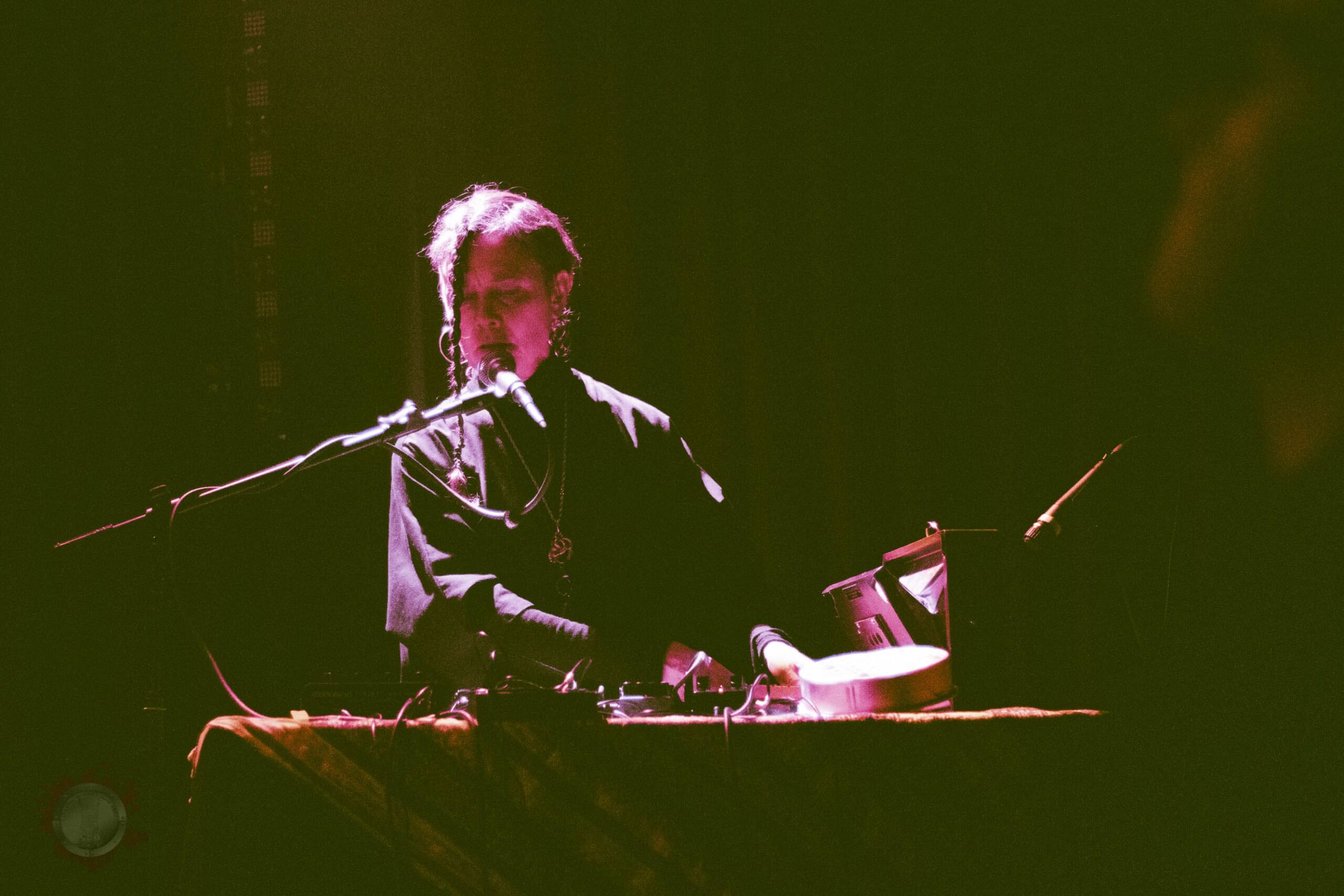 Musicalmente, o concerto foi uma verdadeira exploração de texturas. O baixo ressoava com uma presença física quase palpável, sustentando a densidade sonora enquanto sintetizadores, manipulação da mesa de mistura e instrumentos pouco convencionais produziam sons estranhos, orgânicos e por vezes quase naturais como se ecos da própria paisagem sonora do mundo fossem convocados para dentro da sala. O resultado era uma tapeçaria de drones, ruído e ritmos que se expandia e contraía constantemente, levando a plateia por uma viagem sonora que tanto podia ser meditativa como visceral.