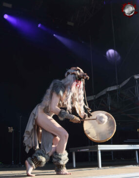 O visual da banda por si só já era um show. O guitarrista, lembrando um druida ancestral; o baixista, com um imponente capuz de lobo; a vocalista, uma verdadeira guerreira tribal; e o baterista… ah, o baterista, vestido como um carrasco medieval, roubando olhares com um figurino tão único que competia com o resto da banda. Cada detalhe das roupas parecia saído de uma saga épica, criando uma estética que misturava arte e combate. O público, hipnotizado, estava pronto para entrar nessa batalha sonora.