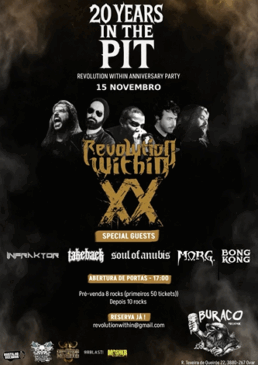 As portas abrem às 17:00h, prometendo uma noite intensa de metal, energia e mosh pits – um verdadeiro tributo às duas décadas de percurso dos Revolution Within, marcadas por dedicação à cena nacional e incontáveis atuações em palcos dentro e fora do país.