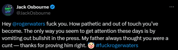 “Ei, Roger Waters, vá se foder. Quão patético e desinformado você se tornou. A única maneira de você chamar atenção hoje em dia é vomitando besteira na imprensa. Meu pai sempre achou você um babaca — obrigado por provar que ele estava certo”