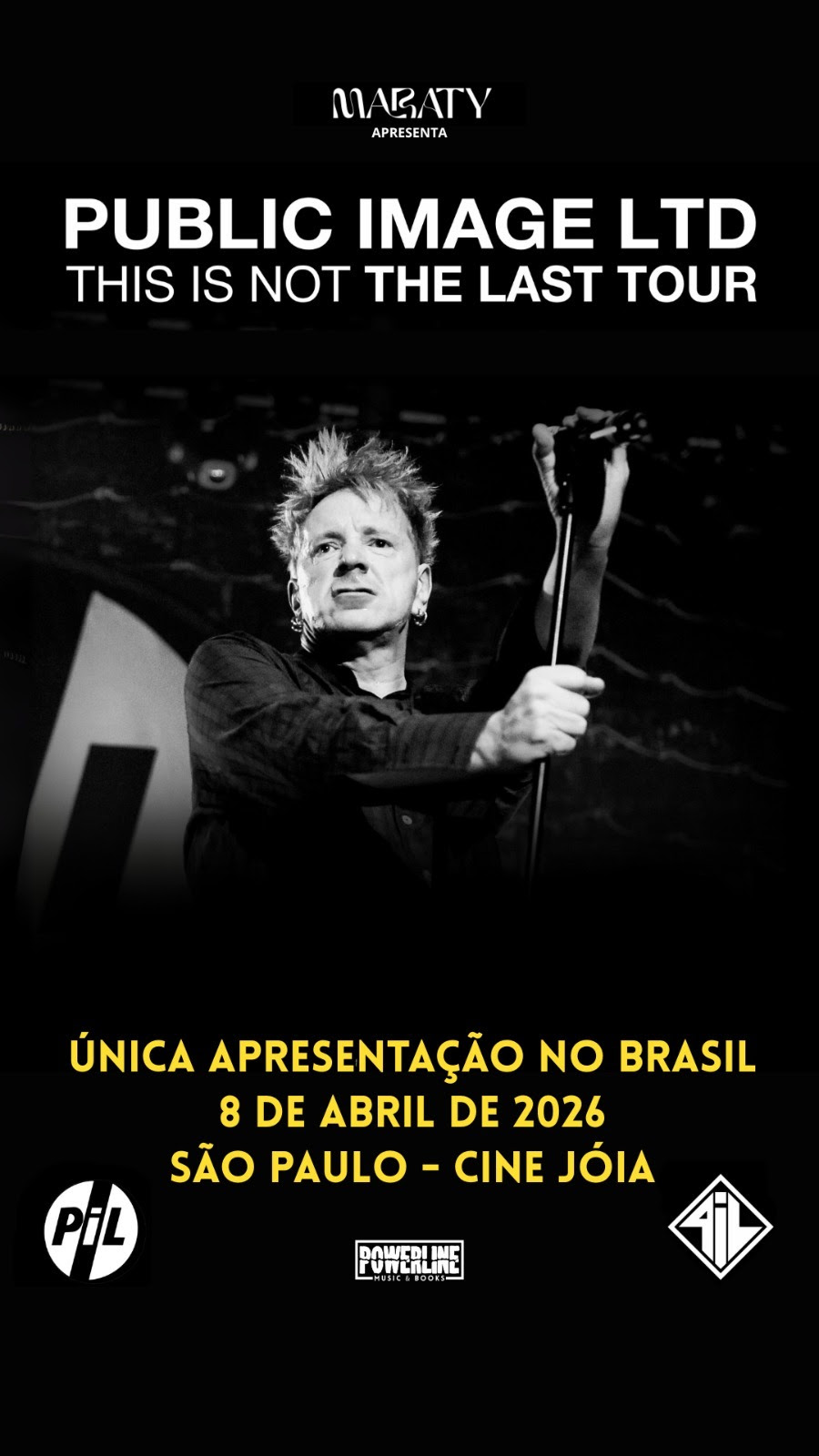 O show único do Public Image Ltd em São Paulo, lendária banda de John Lydon, ícone punk e ex-líder do Sex Pistols, agora será no Cine Joia. A data continua a mesma: 8 de abril de 2026. Ingressos já adquiridos de pista e camarote/mezanino valem para o show no novo local e não há necessidade de trocar. O show inicialmente aconteceria no Terra SP.