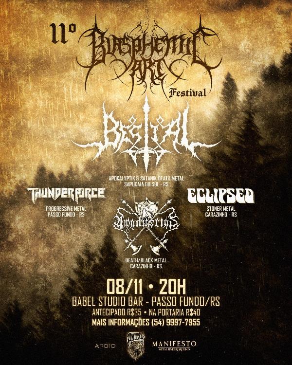 A banda gaúcha Thunder Force levará ao 11º Blasphemic Art Festival – agendado para o dia 8 de novembro – a força de um Heavy Metal que transita entre o Progressivo, Power e o Thrash. Formada em 2005 em Passo Fundo, a banda construiu sua trajetória a partir de composições pesadas e melódicas, que se consolidaram no álbum de estreia “The Game Has Begun” (2023). O 11º Blasphemic Art Festival reunirá ainda diferentes vertentes do som pesado gaúcho, trazendo ainda Bestial (Apokalyptik & Satanik Death Metal, Sapucaia do Sul), Amaduscias (Death/Black Metal, Carazinho) e Eclipsed (Stoner Metal, Carazinho).
